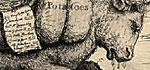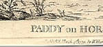 British Museum Description by M. Dorothy George (More ...) 5605 PADDY ON HORSE-BACK An Irishman seated on a bull which is galloping across open country towards London, seen in the distance on the r., St. Paul's being visible. He wears a short jacket and ragged knee-breeches, his legs and feet are bare. His hair is dishevelled and he is urging on the bull with his hat, which is raised in his r. hand. He sits facing the animal's tail, which he holds in his I. hand. From his saddle-bag appear books: St. Pat . . and New System of Fortune Hunting; a paper hangs out of it inscribed with a list of ladies with fortunes, beginning Lady Mary Rotten Rump St. James Square 3o,000£. A sack inscribed Potatoes is tied to the bull in front of the saddle. A milestone shows that it is IIII Miles from [London]. It was an old gibe that Irishmen came to London to make their fortunes by marriage. This attack on the Irish may he connected with the proposals for removing restrictions from Irish trade which were so much opposed by English merchants. |