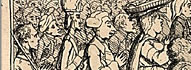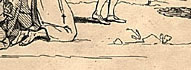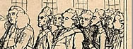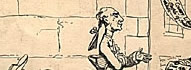 British Museum Description by M. Dorothy George (More ...) 6003 IRISH GRATITUDE. Henry Grattan stands (c.) in profile to the r. facing a deputation of Irish notables who are making the presentation of the money voted to him in the Irish Parliament for his services in securing Irish independence. At the head of the deputation is a short man, the Irish Speaker, E. S. Pery, in his Speaker's wig and robes. He holds out a paper inscribed, Grant of the Sum of £100000 to H. Grattan Esq' and saying, To you 5' as the deliverer of our Country & the establisher of our Peace; the Senate & People of Ireland dedicate this Small token of their Gratitude. Behind the Speaker are two men, arm-in-arm, both wearing ribbons, others crowd behind them. A prominent figure in profile to the l., very lean, resembles caricatures of Flood. Behind Grattan (l.) is a larger crowd of the Dublin populace, all kneeling, with hands held together as if in prayer. They are headed by a monk, behind him are a man in broad-trimmed hat and beard, probably a Jew, and a dissenting minister with lank hair and clerical bands. Other conspicuous figures are a little chimney-sweep in ragged clothes, his brush under his arm, a stout woman with a basket (? of oysters) on her head, a barber with his shaving-dish under his arm, a watchman with staff and lantern, a soldier, a tailor with scissors under his arm. Behind are buildings. The sum first moved (on 30 May) was £100,000, but this was reduced to £5o,ooo. |