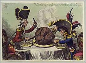 This exhibition offered a rare opportunity to view a large number of Gillray's major works. It also provided examples of his working methods through original sketches and annotated preparatory drawings. There were also oil paper tracings that Gillray used to transfer his drawings to plates. Virtually all of Gillray's best-known works were on display: Very Slippy Weather, Presages of the Millenium, John Bull Taking a Luncheon, The Plumb-pudding in danger, Sin, Death and the Devil, Tiddy-Doll, the Great French Gingerbread-Baker (shown with a preparatory sketch) and many more. All but one of the works were from hand-colored editions that dealers offered to their wealthier customers during Gillray's lifetime. The selection provided an excellent overview of Gillray's satirical brilliance. Each print was accompanied by text written by the exhibition curator, Roberta Wadell that clearly articulated the historical and political context of the work. A rare correspondence written by Gillray in 1800 offered a glimpse into his personality and the complications that could emerge in his business dealings. At the time, Gillray had been commissioned to illustrate Poetry of the Anti-Jacobin but was forbidden to include personal caricatures. In this letter, Gillray refused to let his editor see the work until it was finished. Ultimately, the dispute led to the end of Gillray's involvement with the publication and the destruction of his plates. There was more to be appreciated in this exhibit than could be absorbed in a single visit, but an important aspect of Gillray's work that wasn't emphasized through the prints was his skill as a draftsman and engraver. While the hand-coloring can make Gillray's prints interesting decorative objects, it tends to obscure much of the detail and make the aquatints look muddy. In The Apotheosis of Hoche, for example, the landscape and multitude of figures at the bottom of the print are all but obscured by a heavy application of red paint. The black and white version of Begging No Robbery has a beautiful spatial quality (created by variations in the thickness of line) that is all but flattened in the color version. Gillray's flamboyant linework and meticulous rendering techniques express his obsessive and visionary nature. These qualities are most visible in the black and white editions of his prints, only two of which were on display in the exhibit. Although most of the linework suffers from the coloring, a few prints have details that are enhanced. The diaphanous fabric of ci-devant Occupations is nicely rendered by it's elegant coloring and The Union Club, while losing some of the chaotic frivolity of the black and white edition, is boldly illuminated with blues and reds. Most prints were painted by women who followed guides created by Gillray, but some versions show dramatic variations. The Library's collection includes two versions of Monstrous Craws (one of which is included in this exhibit) that demonstrate how colorists applied different techniques. The works on display present a broad overview of Gillray's work, yet it represents a mere 16% of the Tilden Gillray collection. While the opportunity presented itself, the organizers declined the chance to present the floor-to-ceiling style of installation that was found in early 19th century caricature exhibitions. As a result, the experience for the viewer was satisfying without being oversaturating. Even after viewing the more than 160 works on display, it was possible to leave the exhibit wanting more — and that's one the best indications of a well-crafted exhibit. While it's probably impossible for a single exhibition to encapsulate all of the historical, political, and esthetic layers of significance that can be found in Gillray's work, this exhibit captured most of them. The Library's Print Department has made an important contribution to Gillray's legacy and, thanks to the online version of the exhibit, has created one of the best Gillray references on the Internet. David Donihue |